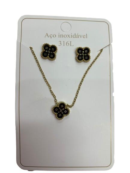 Colar + Brinco Trevo LV Preto c/Dourado - AÇO INOXIDÁVEL